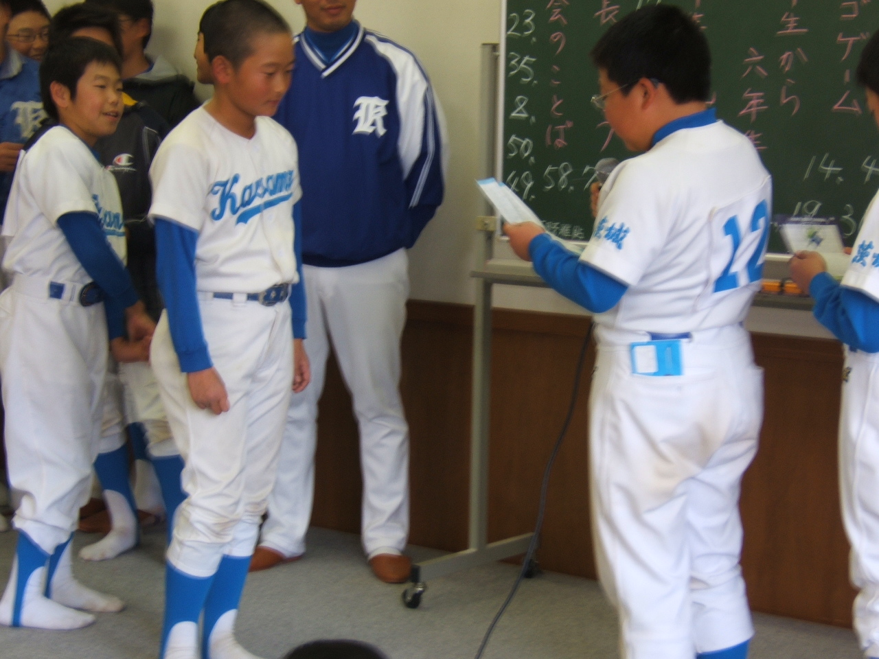 ここまでよく頑張ってきましたね・・・ 暑さに負けず寒さに負けず・・・ 大人のトラブルで監督コーチが変わり・・・ 新監督のもと誠実に良くここまで・・・ しかし最近思うことチームの子は仲良く好き嫌いがあってはだめだよ みんな、笠間スポ少の仲間だよ、仲間外れを作ったり・・・ 邪魔者扱いしたり・・・ 数年間ですが一緒に目標を立ててここまで来たんですよ・・・ 最後まで仲良く、卒業をしてください・・・ 学校生活しっかり、勉強もしっかり・・・ 監督に迷惑をかけないように!!! 最後の試合だね~ 良く頑張って来たねここまで・・・ 最後の思い出を皆で作ろうよそして苦労してる監督を胴上げしよう 中学で野球をやるもよしやらぬもよし自分の人生は自分で・・・ 親に言われてやるならやるなよ!中学に行ったら競争が始まる・・・ 自分の進む方向は自分でお父さんお母さんは君たちの サポーターだけなんですから(笑) なんもできなかった!父母の皆さま方!管理人をお許しを・・・ でもね、こういうはずじゃなかったんじゃ・・・ ここで言ってる僕本人も好き嫌いで・・・ 監督ごめんなさい、お約束守れずにホントにごめん・・・ 貴方には!感謝しております。 反省ばかりしてて(笑)最後の試合そしてこのブログも最後になります 色々言いたい放題!言いすぎご勘弁を父母のみなさん(笑) これも、先輩風だと(笑)御苦労かけてますコーチの皆さん 最後に花咲かせましょうや!笑って終わりにしましょうや! 穏やかな晴天のなか第5回岩間ライオンズ杯が開催 どんよりと・・・ 曇りの大野ファイターズさんをお迎えしての笠間市民球場での 親善試合、春先大野さんにはお世話になり秋の終りに・・・ 今日は寒かったね(笑)大野さんも前日練習試合のあと宿泊。 連戦の中での戦い・・・5年生以下は大差をつけられ大敗です。 今期卒業の6年生チームの戦いは笠間リードの中・・・・・ 大野さんは粘りもありやはり強いね^^ショートの子上手です。 キャプテンの打力ビックリ3,4番はほんとビックリです^^ 今期お世話になりましたこと改めてお礼申し上げます。。。 来週は県西新人大会です。5年生以下の新チーム頑張れ^^ 今回の悔しさを練習で頑張り一戦必勝!!! 卒業する六年生たちは君たちの頑張りに期待してるよ!!! 入場前まだ眠いでしょ(笑) 元気に行進! 何時も思うが感動です 60チーム以上の行進素晴らしい 行くぞ~~ 元気出そうよ。。。 頑張っていこうぜ! はい、当日は朝5:00起き6:00集合現地開会式球場へ 8:00からの開会式笠間の球児も元気に行進昨年は3回 戦へ。。。今年もがんばるぞ~。。。 試合は第2試合11:30~時間調整や移動で疲れたか(笑) エース不在ショート池田も現地でストレッチ中背中を痛め チームの雰囲気も下がり気味(ほんとにすみませんでした) 池田からの談話。。。僕も叱っときましたご迷惑スミマセン 試合も20点以上取られる乱調ペース・・・ こんなの初めてです試合前のモチベーションの上げ方を 考えなければなりませんね。。。監督コーチすみません。。。